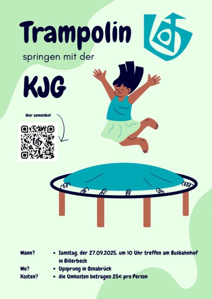 Die KjG Billerbeck lädt alle Kinder von 8-14 Jahren zur nächsten Trampolinfahrt ein! Gemeinsam geht es mit dem Bus ins Upsprung nach Osnabrück, wo wir uns bei 2 Stunden Sprungzeit so richtig austoben und jede Menge Spaß haben werden.